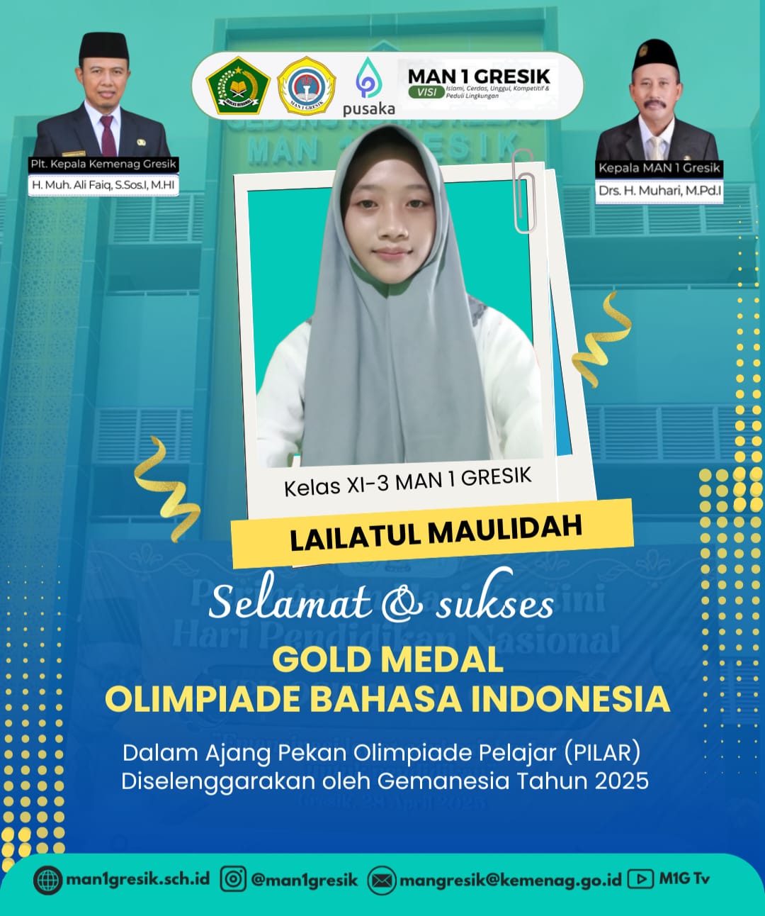 Alhamdulillah. Salah satu siswa berprestasi MAN 1 Gresik kembali menorehkan prestasi membanggakan di tingkat nasional. Adalah Lailatul Maulidah, siswi kelas XI-3, yang berhasil meraih Gold Medal dalam Olimpiade Bahasa Indonesia pada ajang Pekan Olimpiade Pelajar (PILAR) tingkat nasional yang diselenggarakan oleh GEMANESIA tahun 2025.