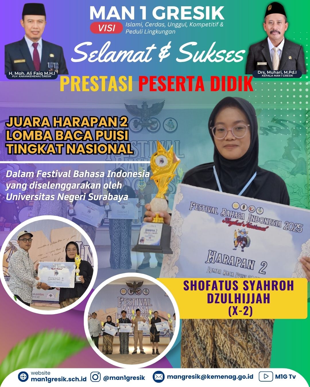 Catatan prestasi membanggakan kali ini sukses dipersembahkan oleh salah satu siswa MAN 1 Gresik yang kini tercatat sebagai siswa di kelas X-2. Siswa tersebut bernama Shofatus Syahroh Dzulhijjah. Ia sukses mengharumkan nama MAN 1 Gresik setelah menjadi juara harapan 2 lomba baca puisi tingkat nasional. ia sukses meraih peringkat 5 terbaik dalam Festival Bahasa Indonesia yang diselenggarakan oleh Fakultas Bahasa dan Seni Universitas Negeri Surabaya.