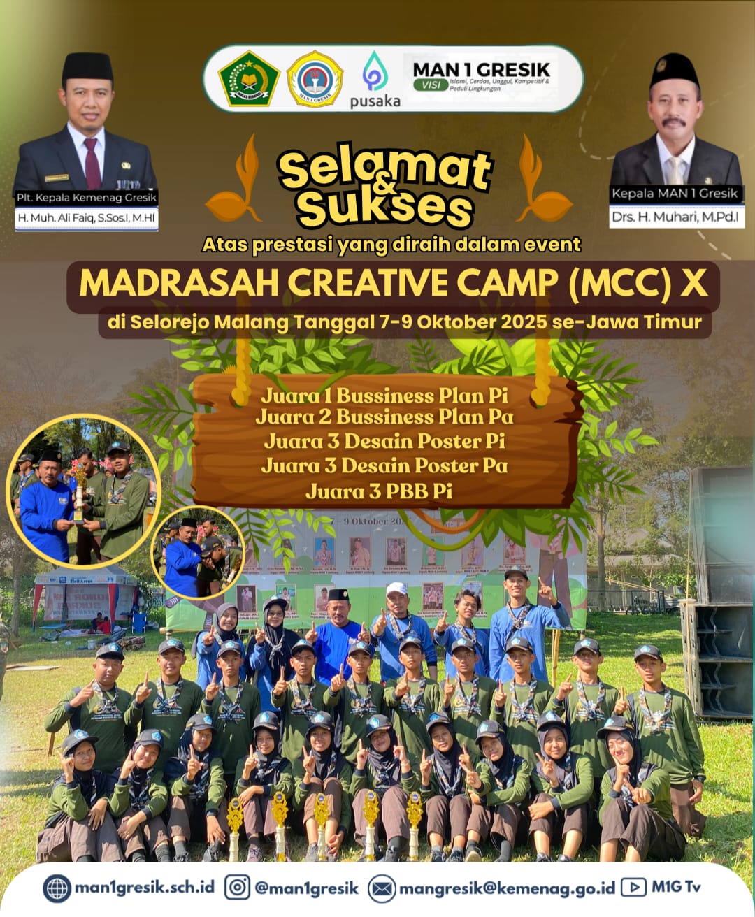 Luar Biasa! MAN 1 Gresik kembali menorehkan prestasi membanggakan di ajang Madrasah Creative Camp (MCC) ke-10 tingkat Jawa Timur yang diselenggarakan pada 7–9 Oktober 2025 di Selorejo, Malang. Dalam event bergengsi yang diikuti oleh berbagai madrasah dari seluruh Jawa Timur ini, kontingen MAN 1 Gresik berhasil memborong lima penghargaan di berbagai kategori lomba.