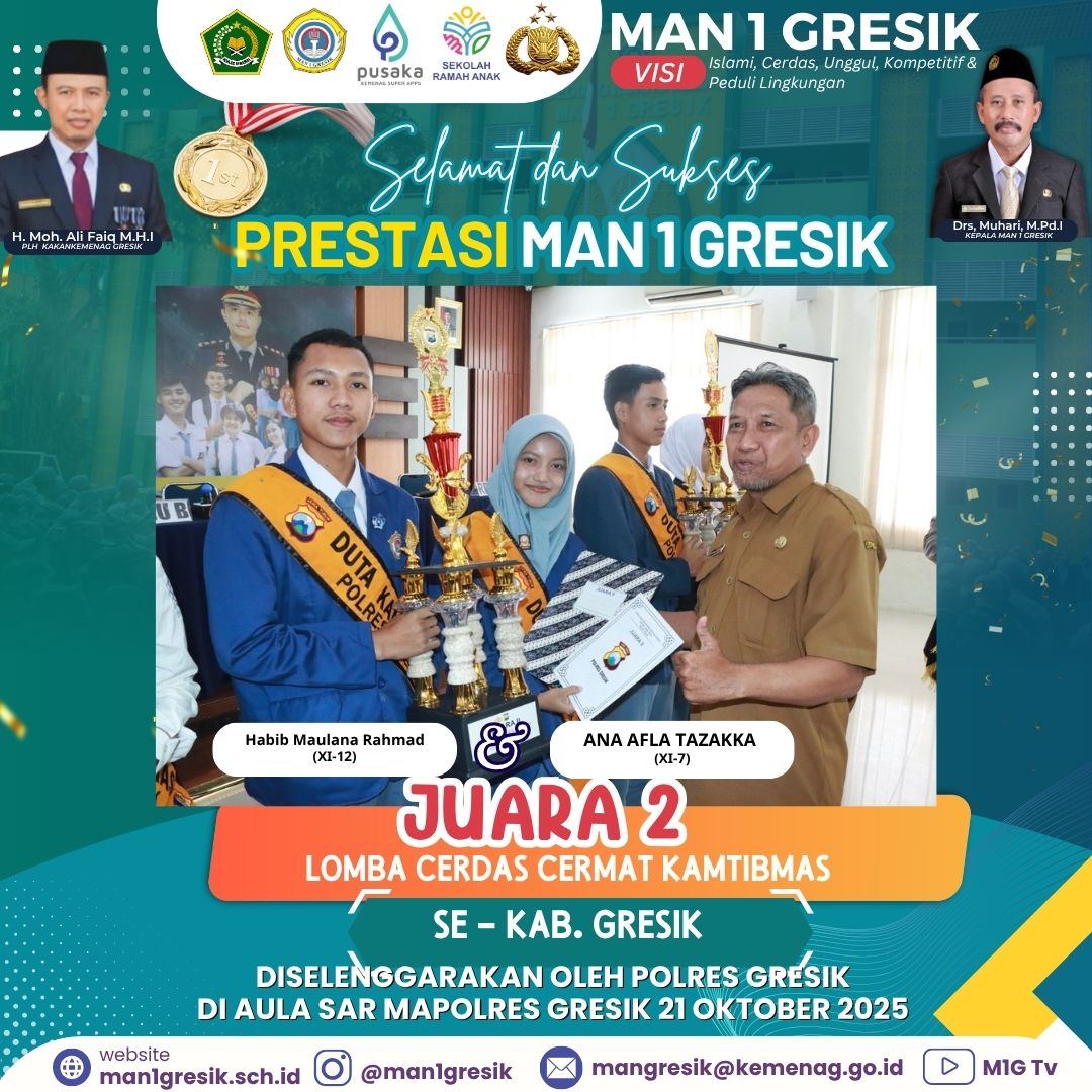 Kepala MAN 1 Gresik, Drs. H. Muhari, M.Pd,I mengucapkan selamat kepada Habib Maulana Rahmad dan Ana Afla Tazakka. Beliau mengapresiasi dua siswa MAN 1 Gresik yang juga menjabat sebagai ketua MPK dan Ketua OSIS. Dua siswa tersebut merupakan contoh bahwa aktif organisasi tidak menjadi penghalang untuk berprestasi.