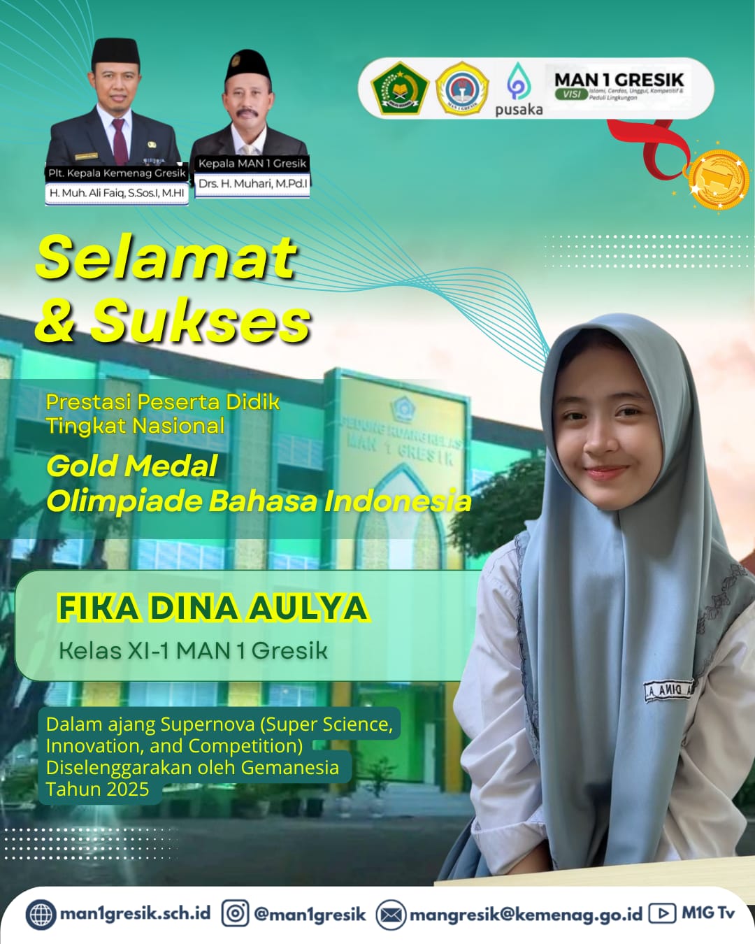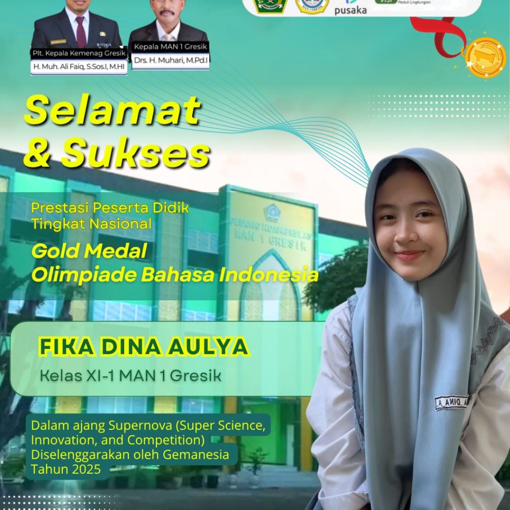 Salah satu peserta didik MAN 1 Gresik kembali menorehkan prestasi membanggakan di tingkat nasional. Fika Dina Aulya, siswi kelas XI-1 MAN 1 Gresik, berhasil meraih Gold Medal Olimpiade Bahasa Indonesia dalam ajang Supernova (Super Science, Innovation, and Competition) yang diselenggarakan oleh Gemanesia tahun 2025.