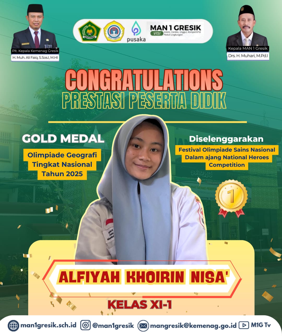 MAN 1 Gresik kembali menorehkan prestasi gemilang. Ialah Alfiyah Khoirin Nisa’ (XI-1), yang berhasil meraih Gold Medal bidang Geografi dalam ajang National Heroes Competition (NHC) yang diselenggarakan oleh Fosnas pada tingkat nasional tahun 2025.