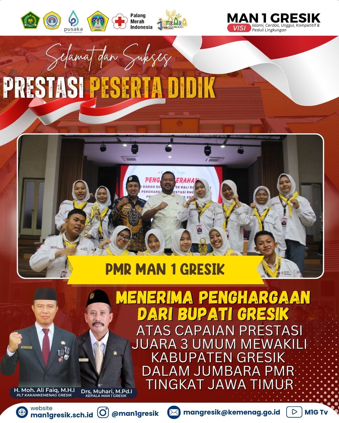 PMR MAN 1 Gresik mendapatkan kesempatan istimewa dari pemerintah Kabupaten Gresik. Kesuksesannya dalam mengharumkan nama Kabupaten Gresik di tingkat Jawa Timur berbuah manis. Kepala MAN 1 Gresik pun diundang oleh Pemkab dan PMI Kabupaten Gresik dalam penganugerahan relawan berprestasi yang tertuang dalam surat bernomor 297/02.06..03/ADM/XI/2025.
