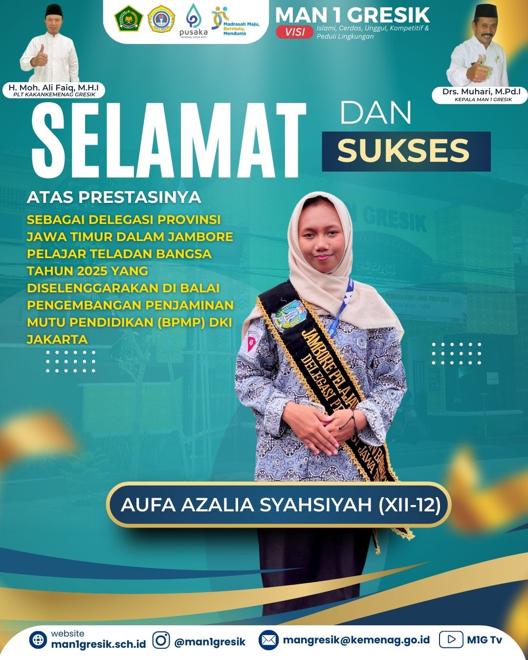Prestasi membanggakan kali ini dipersembahkan oleh Aufa Azalia Syahsiyah. Siswa yang tercatat dudukl di kelas XII-12 tersebut berhasil mengharumkan nama madrasah dan juga Kabupaten Gresik di kancah nasional. Hal tersebut berkah capaiannya sebagai delegasi pelajar Jawa Timur dalam Jambore Pelajar Teladan Bangsa tingkat Nasional.