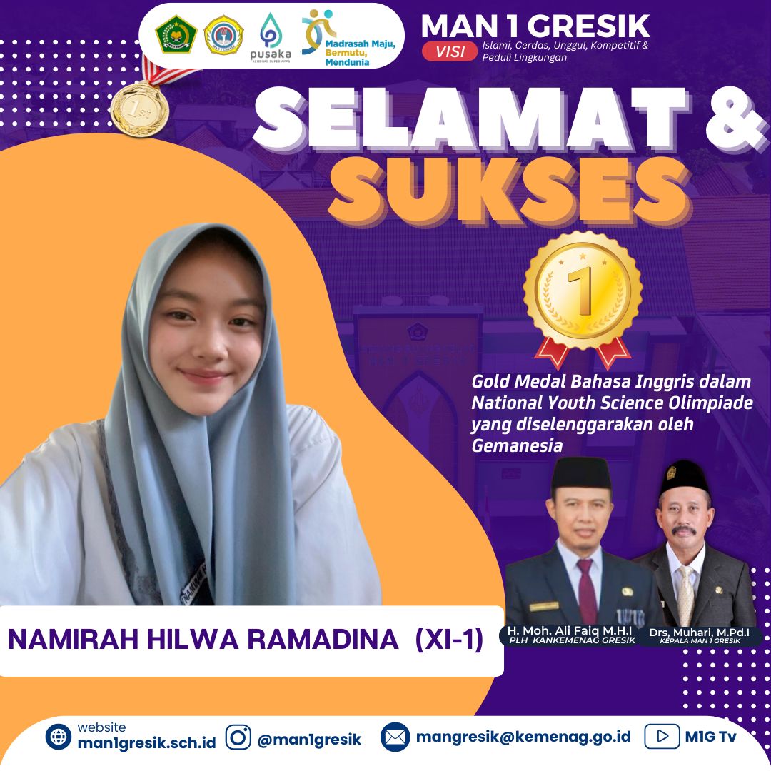 Siswa yang sukses meraih gold medal yaitu Namirah Hilwah Ramadina. Siswa yangbtercatat sebagai siswa kelas XI-1 tersebut berhasil menjadi yang terbaik dalam olimpiade Bahasa Inggris tingkat nasional. Dia berhasil menyisihkan ratusan peserta dari berbagai daerah dalam kompetisi yang diselenggarakan oleh Gemanesia.