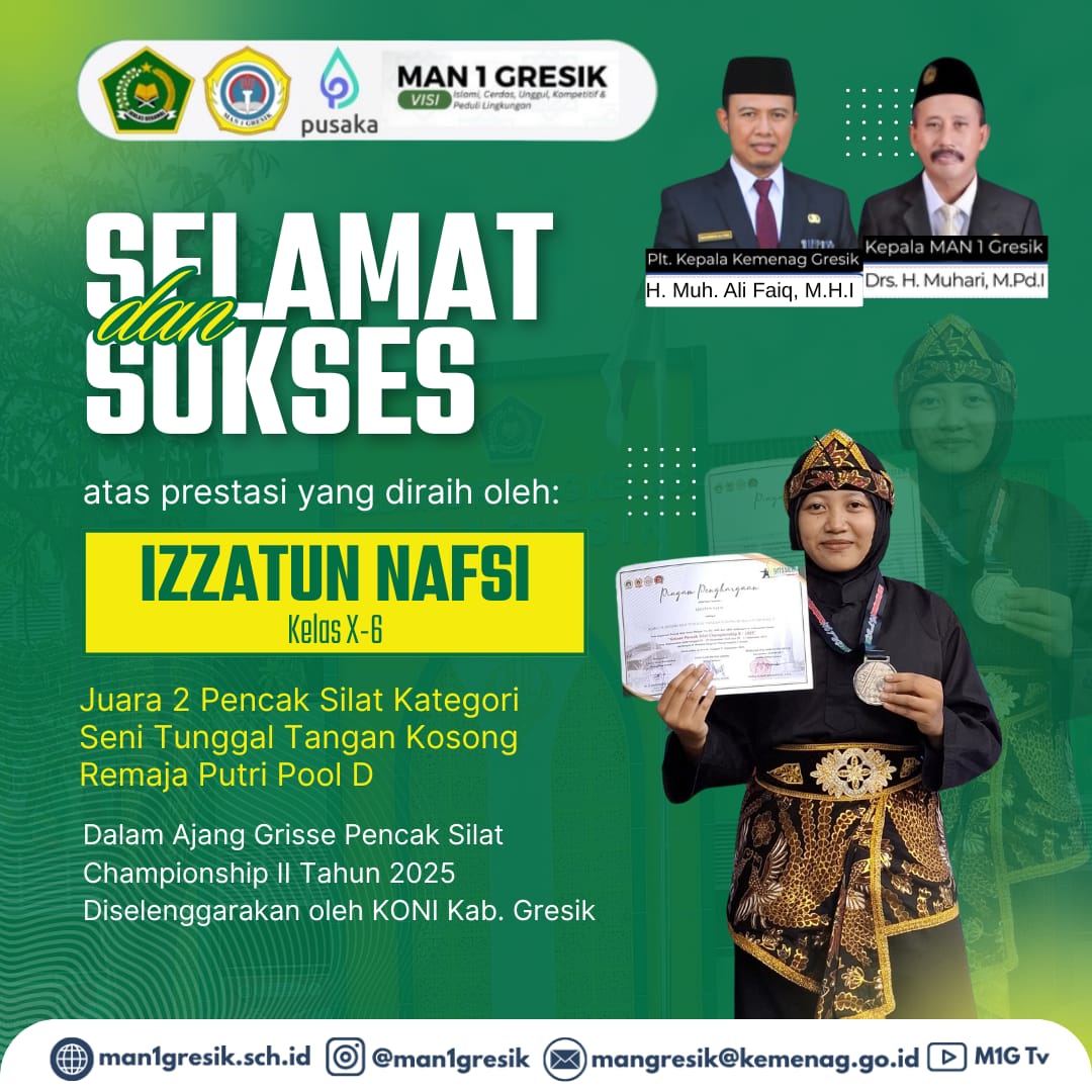 Luar biasa. Pendekar MAN 1 Gresik kembali menorehkan prestasi membanggakan. Dengan penuh dedikasi dan ketekunan, Izzatun Nafsi, siswi kelas X-6 berhasil meraih Juara 2 Pencak Silat Kategori Seni Tunggal Tangan Kosong Remaja Putri Pool D dalam ajang Grisse Pencak Silat Championship II Tahun 2025.
