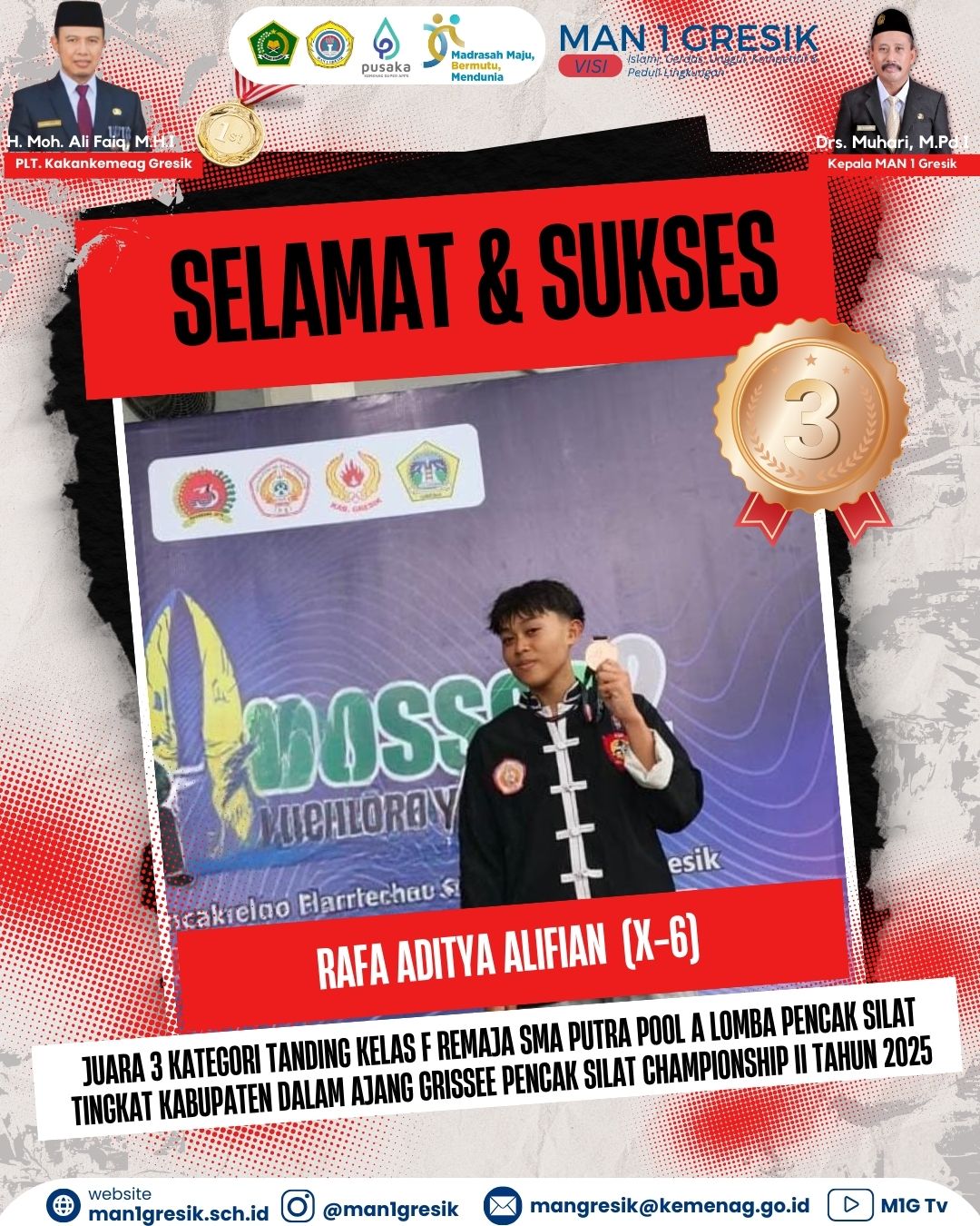 Catatan prestasi kembali dipersembahkan oleh siswa MAN 1 Gresik dalam bidang olahraga pencak silat. Kali ini prestasi dipersembahkan Rafa Aditya Alfian. Siswa yang tercatat duduk di bangku kelas X-6 MAN 1 Gresik tersebut sukses menjadi juara 3 dalam Grisse Pencak Silat Championship II tahun 2025