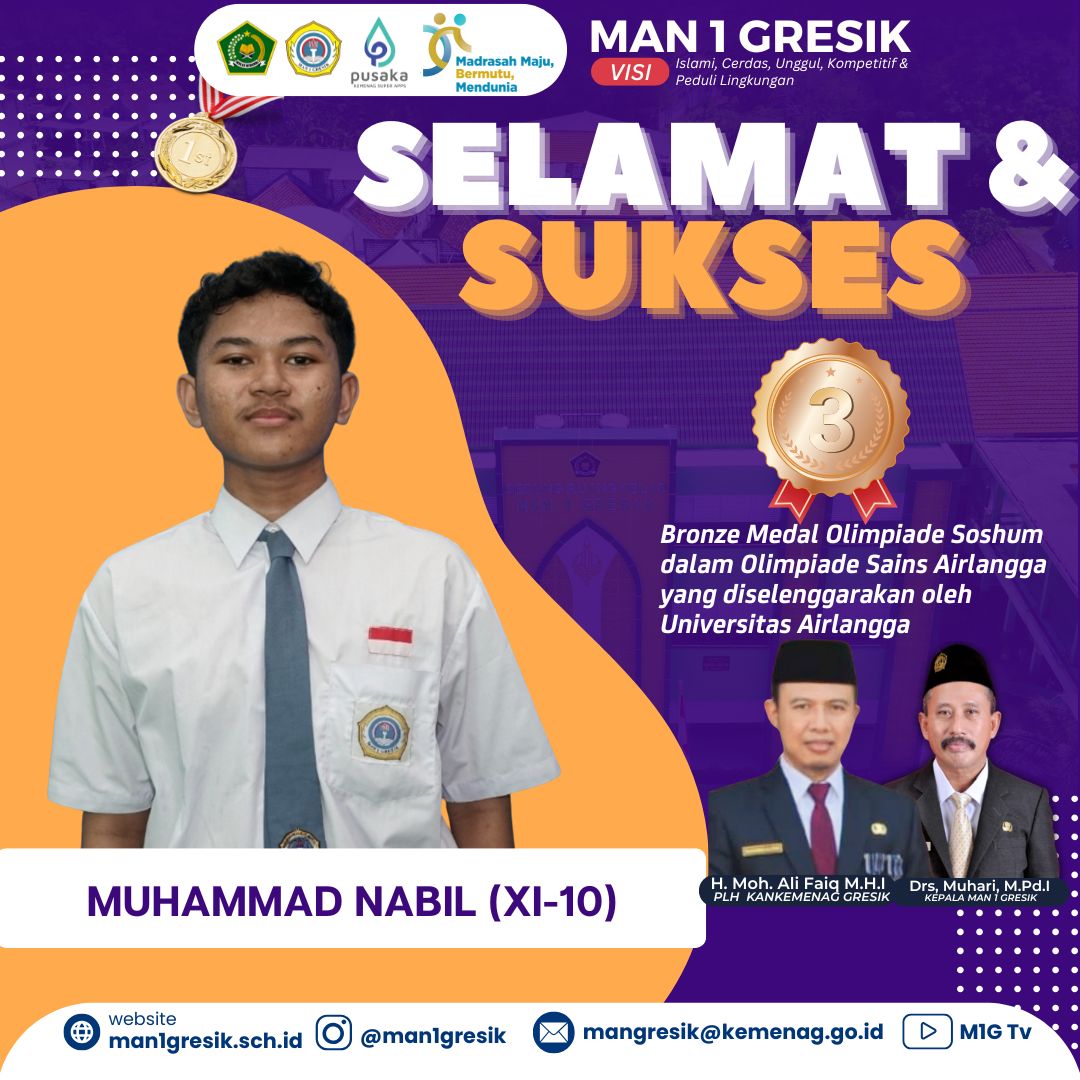 Meski telah memasuki hari libur semester ganjil, semangat siswa MAN 1 Gresik dalam meraih prestasi tidak pernah padam. Prestasi membanggakan kali ini dipersembahkan oleh siswa MAN 1 Gresik bernama Nayla Diana Kamela. Ia sukses menorehkan 1 bronze medal Olimpiade Sosial Humaniora tingkat nasional. Olimpiade yang diikuti oleh ratusan peserta dari berbagai daerah di Indonesia tersebut diselenggarakan oleh Universitas Airlangga Surabaya.