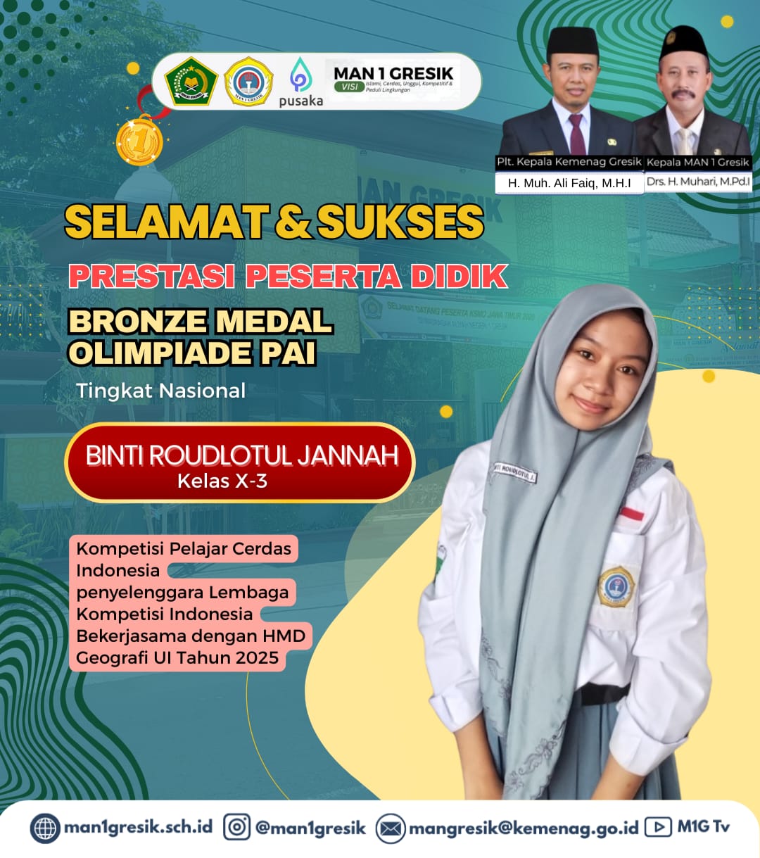 Menjelang akhir tahun 2025, siswa/i MAN 1 Gresik tiada henti mengukir prestasi. Binti Roudlotul Jannah, siswi kelas X-3, berhasil meraih Medali Perunggu (Bronze Medal) pada Olimpiade Pendidikan Agama Islam (PAI) Tingkat Nasional. Capaian ini menjadi bukti nyata bahwa semangat belajar, ketekunan, dan kesungguhan dalam menimba ilmu mampu mengantarkan peserta didik menuju prestasi gemilang di kancah nasional.