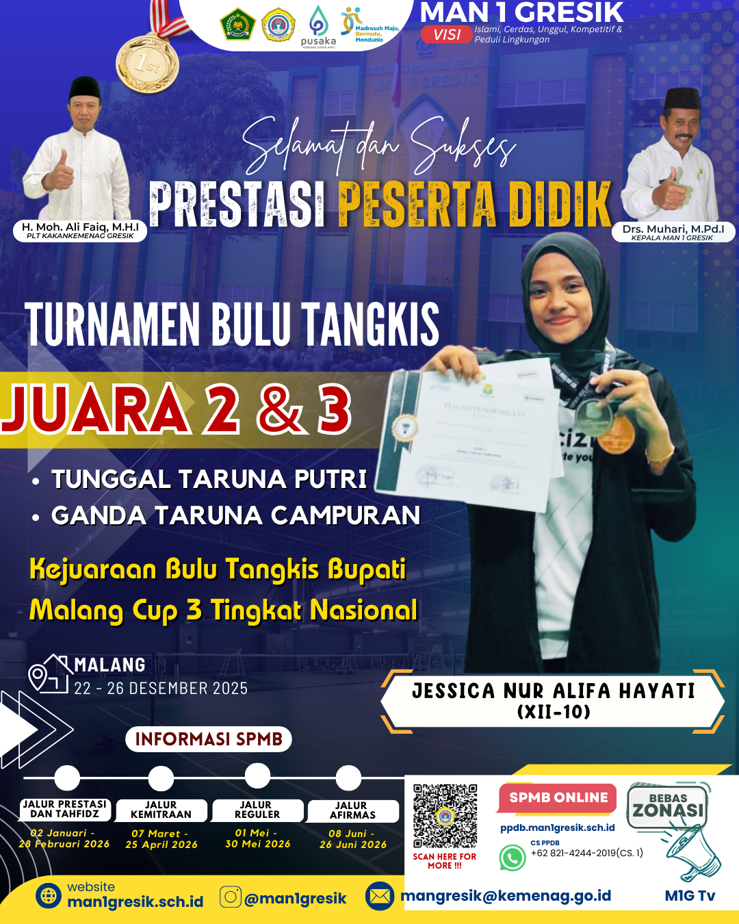 Jessica Nur Alifa siswa kelas XII-10 MAN 1 Gresik kembali mencatatkan namanya sebagai salah satu siswa beprestasi. Siswa asli Gresik tersebut sukses memborong dua gelar sekaligus dalam kejuaraan bulu tangkis Bupati Malang Cup ke-3 Tingkat Nasional.