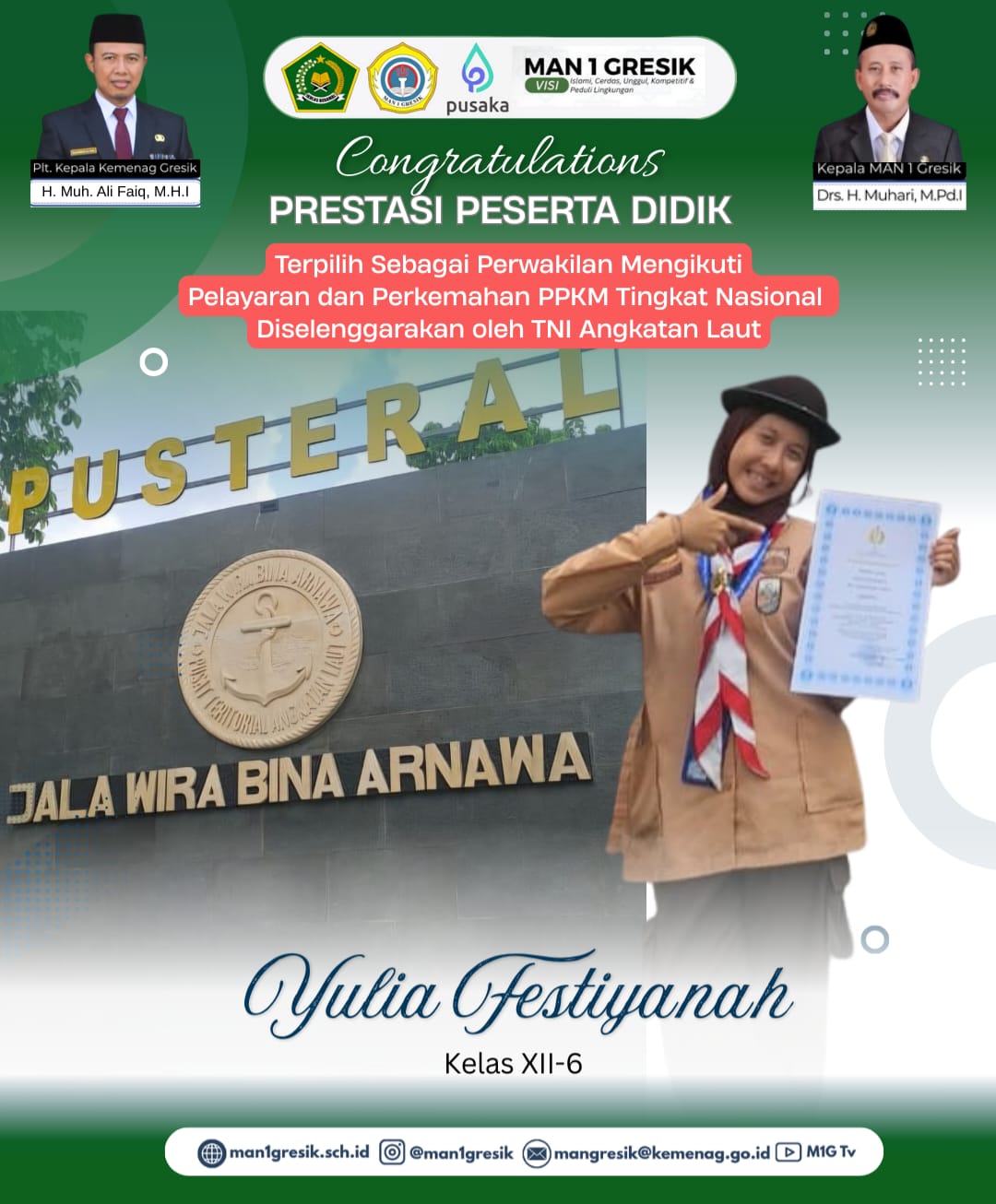 Kabar membanggakan kembali ditorehkan MAN 1 Gresik. Siswi kelas XII-6, Yulia Festiyanah, berhasil terpilih menjadi perwakilan dalam kegiatan Pelayaran dan Perkemahan Program Pembentukan dan Pengembangan Karakter Maritim (PPKM) Tingkat Nasional yang diselenggarakan oleh TNI Angkatan Laut. Kegiatan PPKM merupakan program TNI AL yang digagas untuk membentuk jiwa Saka Bahari dan karakter kemaritiman pemuda Indonesia, sekaligus menumbuhkan kesadaran bela negara. Melalui perkemahan dan pelayaran nasional ini, generasi muda pramuka Saka Bahari dari berbagai daerah diajak mengembangkan kemandirian dan semangat kompetisi, memperkuat rasa kebangsaan sekaligus kesiapan sebagai komponen cadangan negara.