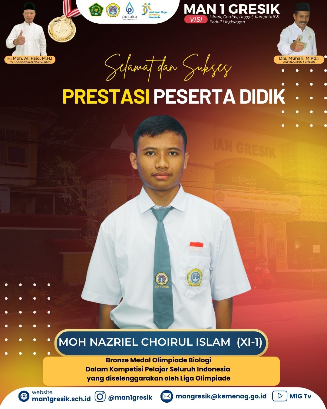 Memasuki pekan terakhir bulan Januari 2026, semangat siswa MAN 1 Gresik dalam meraih prestasi terus membara. Hal itu dibuktikan oleh Moh. Nazriel Choirul Islam siswa kelas XI-1. Siswa tersebut berhasil menorehkan bronze medal dalam olimpiade sosiologi tingkat nasional.