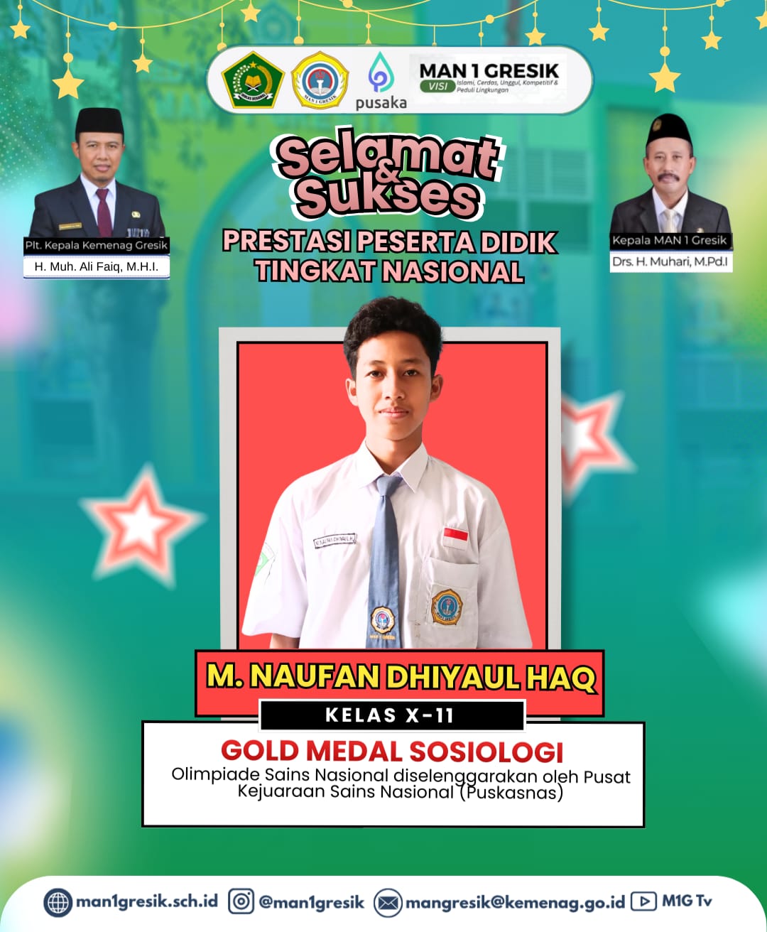 Kabar membanggakan kembali datang dari MAN 1 Gresik. Salah satu peserta didik, M. Naufan Dhiyaul Haq, siswa kelas X-11, berhasil menorehkan prestasi gemilang dengan meraih Gold Medal Bidang Sosiologi pada ajang Olimpiade Sains Nasional yang diselenggarakan oleh Pusat Kejuaraan Sains Nasional (PUSKASNAS).