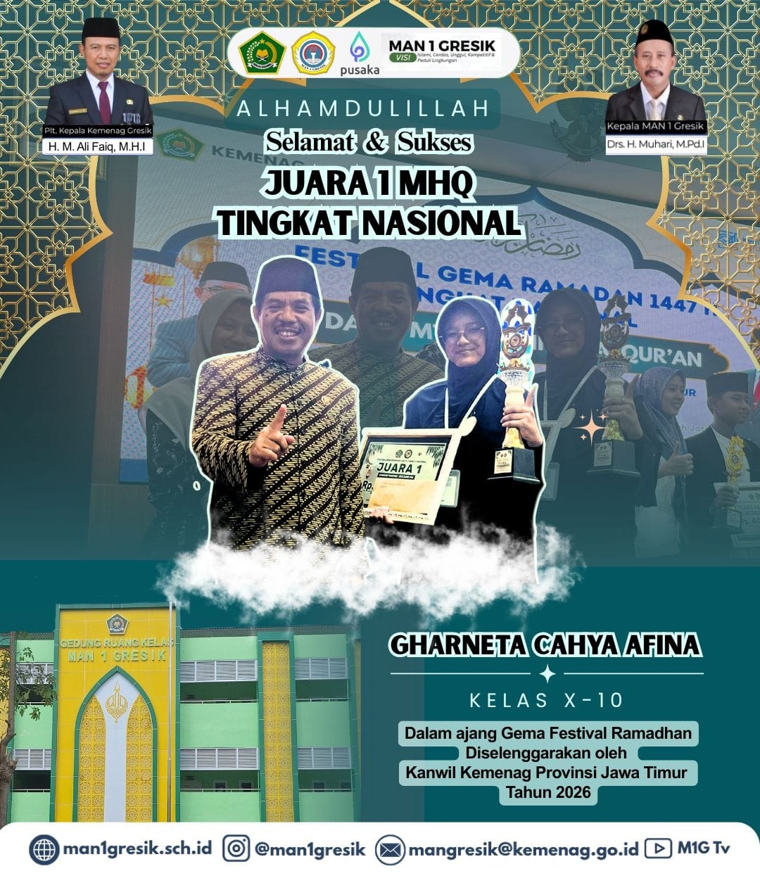 Prestasi membanggakan kembali ditorehkan oleh peserta didik MAN 1 Gresik. Dalam ajang Gema Festival Ramadhan Tahun 1447 H / 2026 M yang diselenggarakan oleh Kanwil Kemenag Provinsi Jawa Timur, salah satu siswi terbaiknya berhasil meraih Juara 1 MHQ Tingkat Nasional.