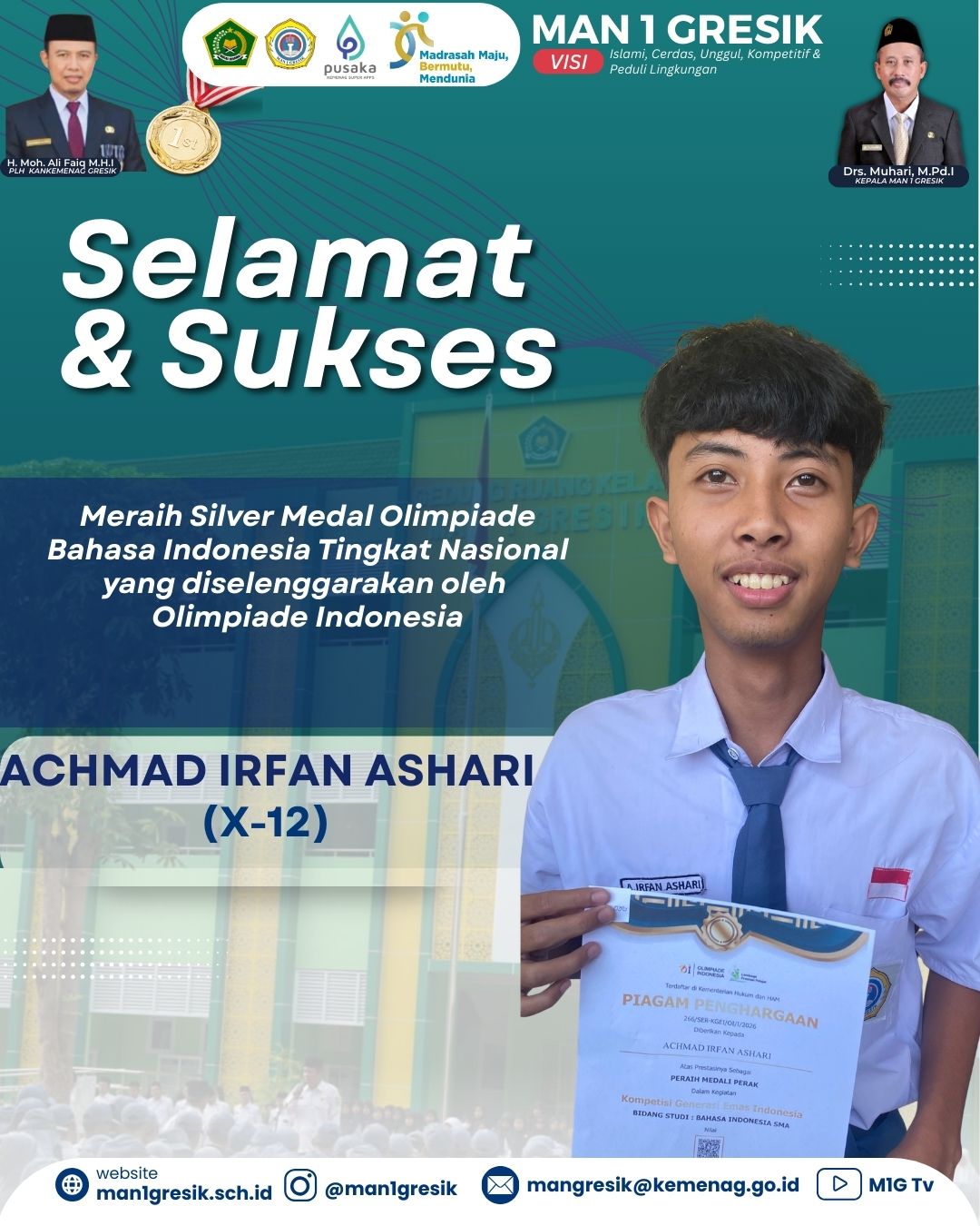 MAN 1 Gresik terus menorehkan prestasi demi prestasi membanggakan. Bulan Ramadan pun bukan menjadi ganjalan siswa MAN 1 Gresik untuk meraih prestasi. Prestasi kali ini dipersembahkan oleh siswa MAN 1 Gresik yang duduk di kelas X-12. Siswa tersebut bernama Achmad Irfan Ashari.