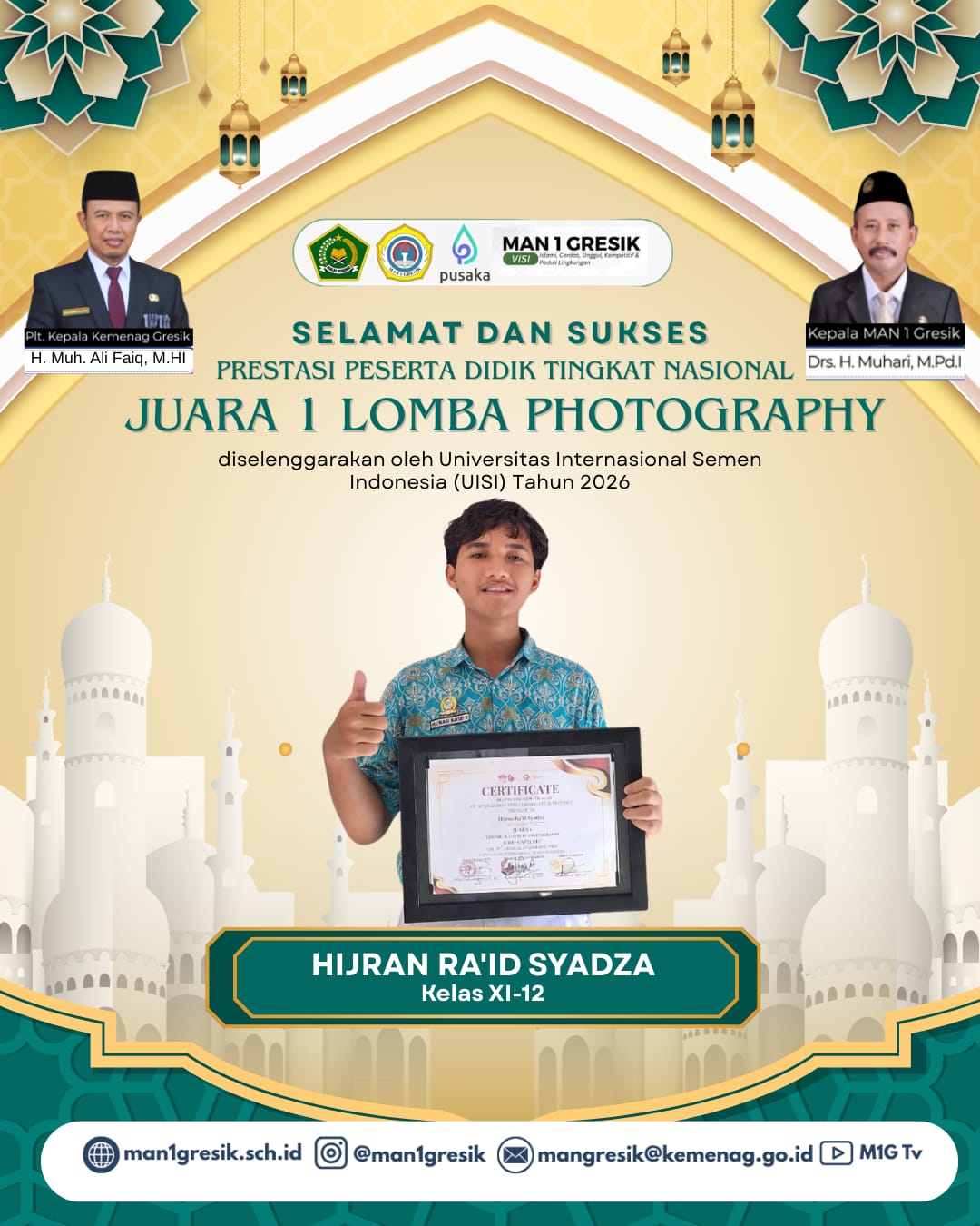 “Kami mengucapkan selamat dan sukses kepada ananda Hijran Ra’id Syadza atas prestasi gemilang sebagai Juara 1 Lomba Photography tingkat nasional yang diselenggarakan oleh Universitas Internasional Semen Indonesia. Prestasi ini menjadi bukti bahwa siswa MAN 1 Gresik memiliki potensi besar dalam bidang kreativitas dan seni. Semoga keberhasilan ini menjadi inspirasi bagi seluruh peserta didik untuk terus berkarya, berprestasi, dan mengharumkan nama madrasah di tingkat nasional maupun internasional.”