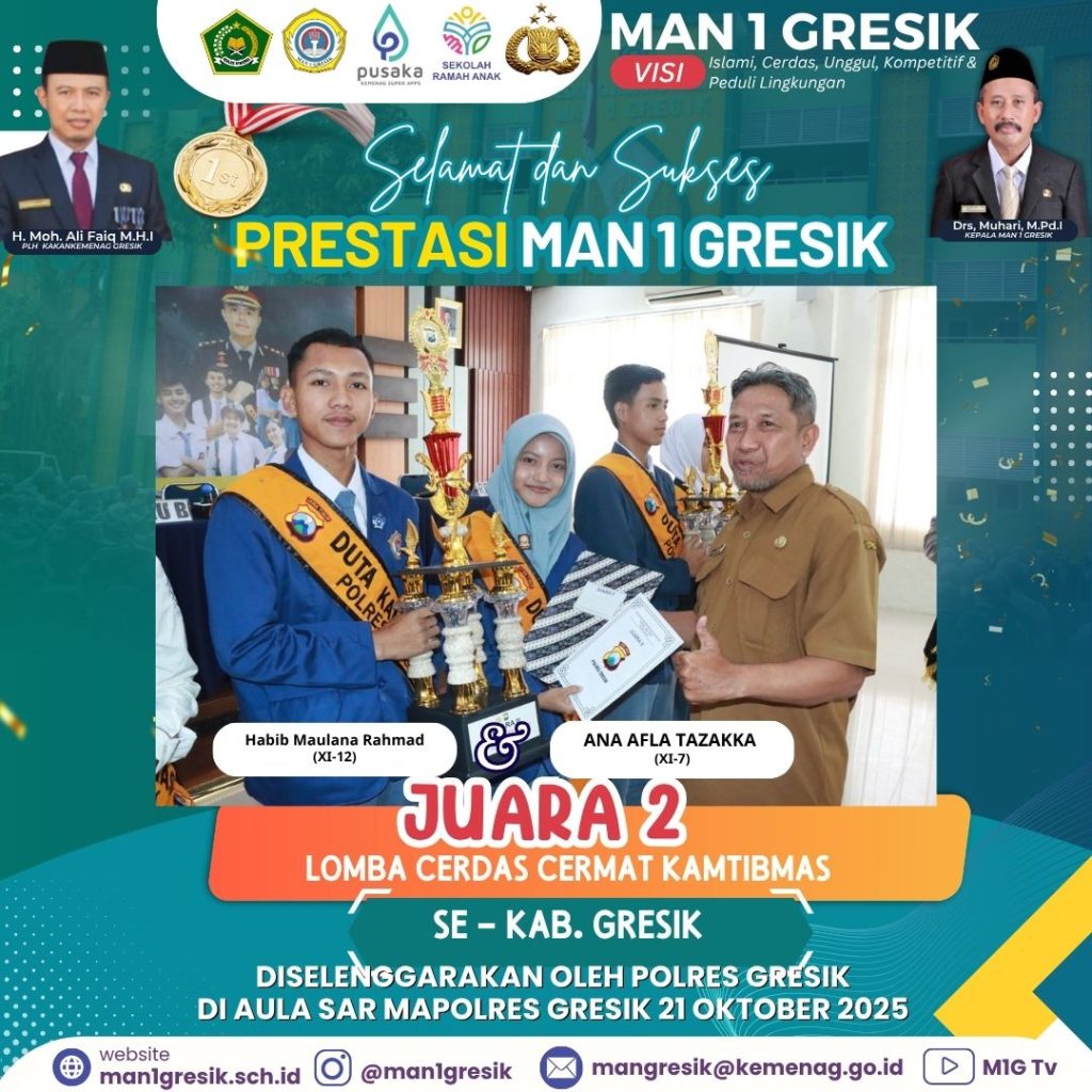 Profil MAN 1 Gresik Identitas Madrasah Nama Madrasah : Madrasah Aliyah Negeri 1 Gresik Status : Negeri/Reguler NPSN : 20580204 NSM : 131235250001 Nomor Telepon/Faximile : (031) 3949544, Fax. (031) 3949544 Email : mangresik@kemenag.go.id Homepage : http//www.man-gresik.sch.id. Alamat : Jl. Raya Bungah 46 Gresik Kecamatan : Bungah Kabupaten : Gresik Kode Pos : 61152…