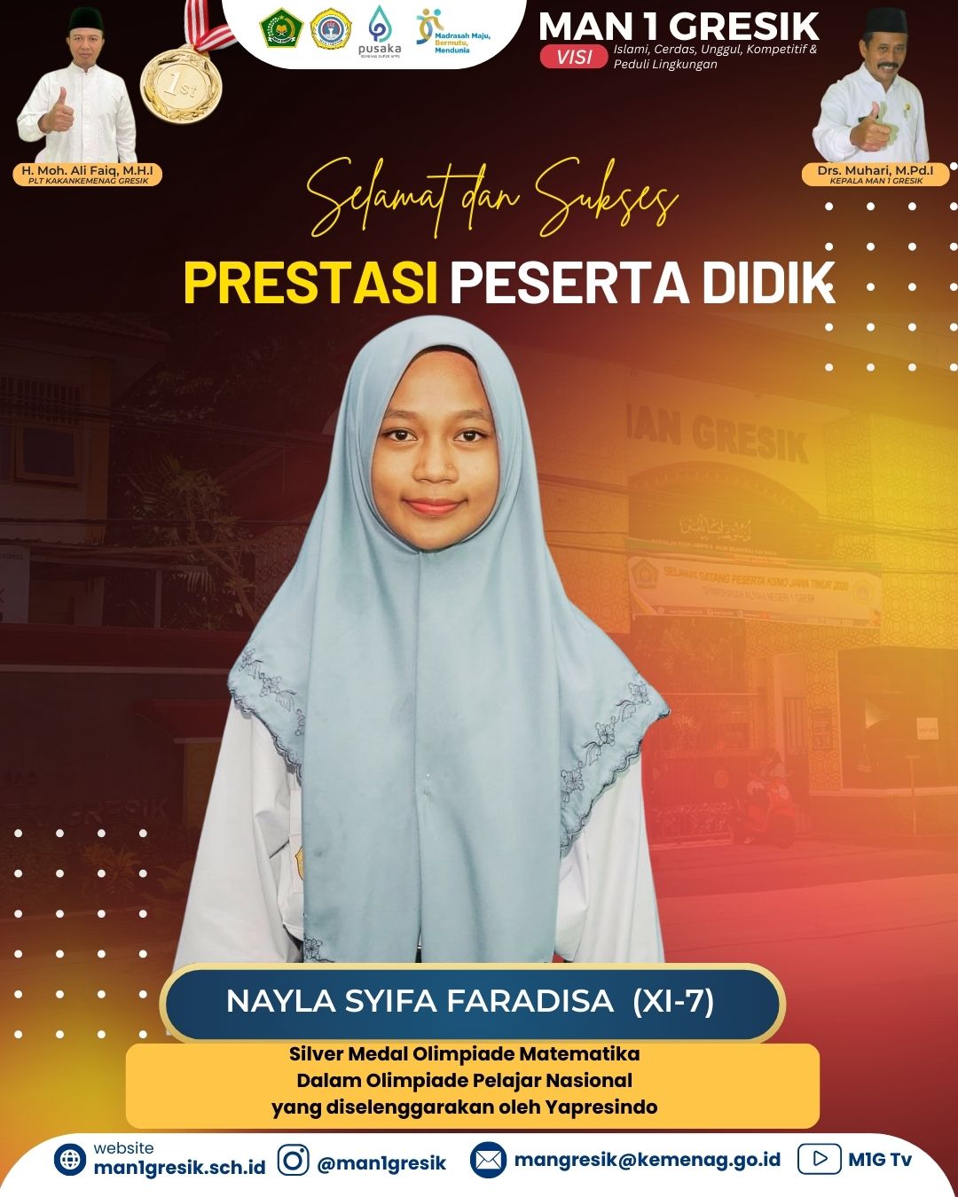 Read MorePrestasi Membanggakan di Tingkat NasionalMAN 1 Gresik kembali menorehkan prestasi gemilang di kancah nasional. Salah satu peserta didik terbaiknya, Zaskia Lidia Saputri, siswi kelas X-2, berhasil meraih Medali Perak (Silver Medal) bidang Bahasa Indonesia dalam ajang Olimpiade Pelajar Indonesia. Kompetisi bergengsi ini diselenggarakan oleh BEM Fakultas Pertanian Institut Pertanian Bogor (IPB) bekerja sama dengan Smart…