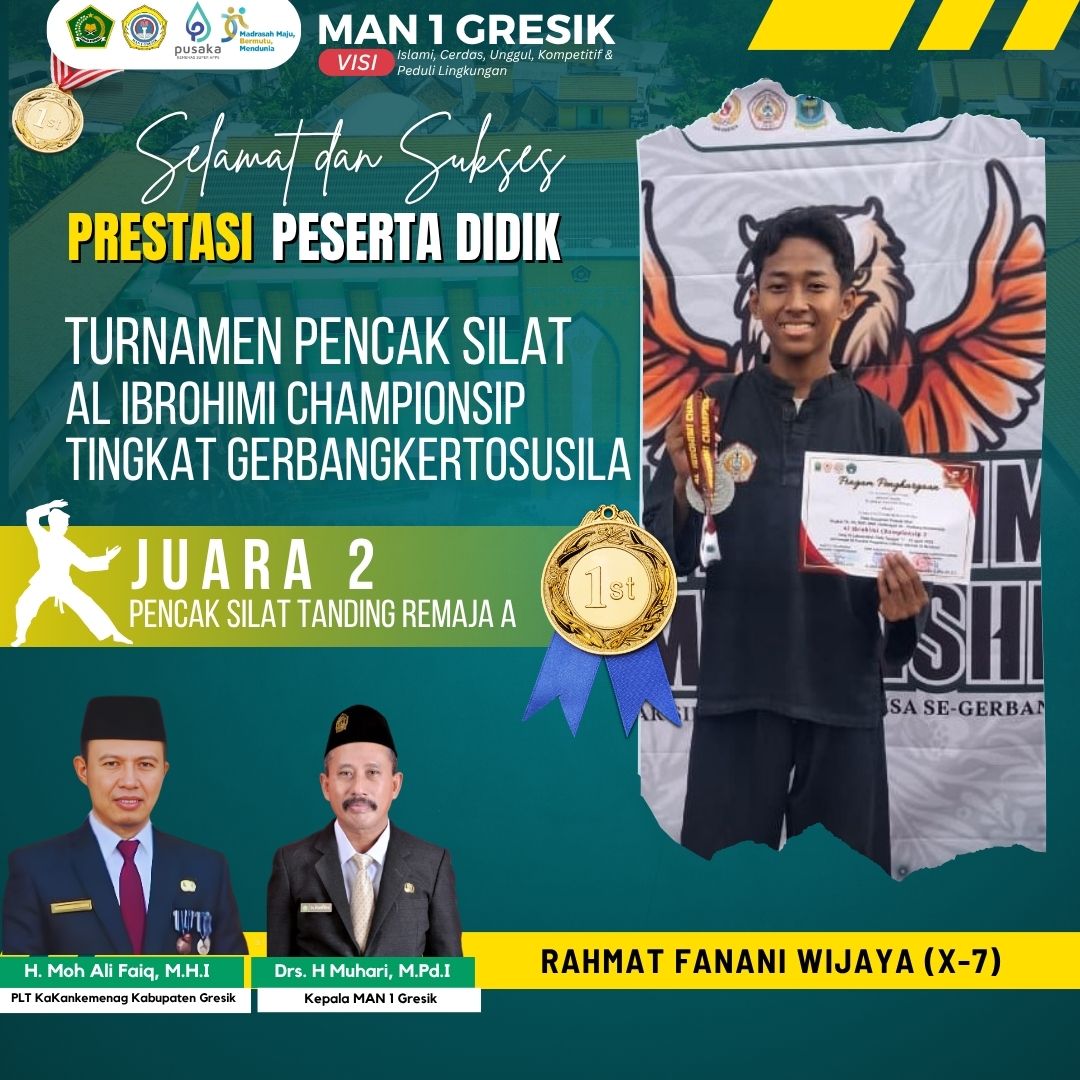 Catatan mengesankan kembali dipersembahkan oleh siswa MAN 1 Gresik dalam bidang olahraga pencak silat. Kali ini prestasi dipersembahkan oleh Rahmat Fanani Wijaya. Siswa yang tercatat duduk di bangku kelas X-7 MAN 1 Gresik tersebut sukses menjadi juara 2 dalam kejuaraan Pencak Silat Al Ibrohimi Championsip 2026. Rahmat Fanani Wijaya menjadi salah satu siswa MAN 1…