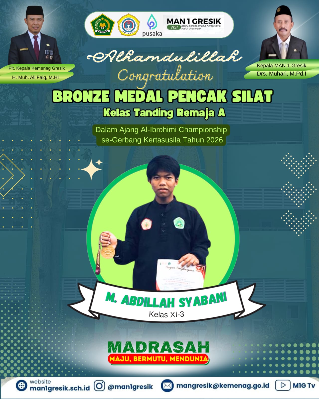 Prestasi membanggakan kembali diraih oleh siswa MAN 1 Gresik. Dalam ajang Al-Ibrohimi Championship se-Gerbang Kertasusila 2026, salah satu siswa berhasil menorehkan prestasi pada cabang olahraga pencak silat. M. Abdillah Syabani dari kelas XI-3 berhasil meraih Medali Perunggu (Bronze Medal) pada kategori Kelas Tanding Remaja A. Prestasi ini merupakan hasil dari kerja keras, latihan yang disiplin,…