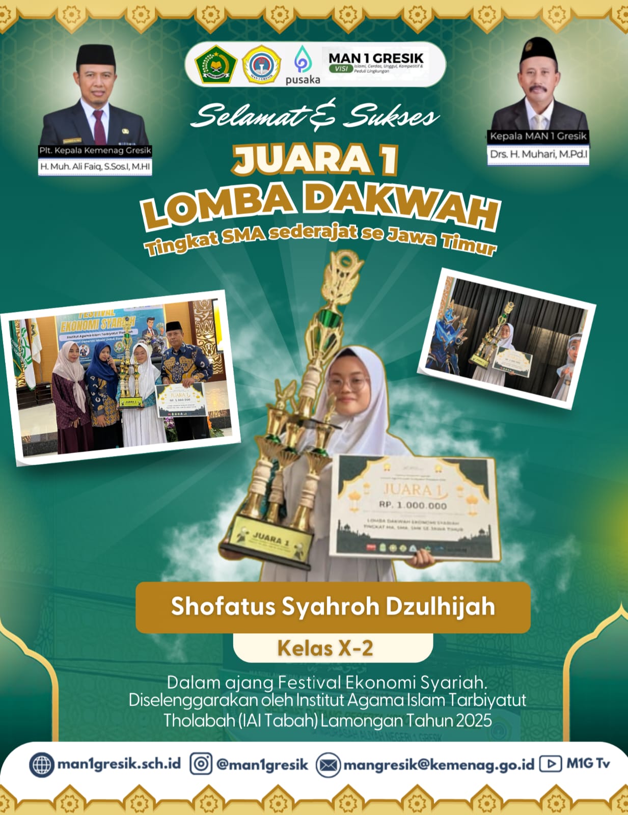 Read MoreAlhamdulillah luar biasa.MAN 1 Gresik kembali menorehkan prestasi gemilang melalui kiprah salah satu siswinya, Shofatus Syahroh Dzulhijah dari kelas X-2. Pada Festival Ekonomi Syariah yang diselenggarakan oleh Institut Agama Islam Tarbiyatut Tholabah, Shofa berhasil meraih Juara 1 dalam Lomba Dakwah Ekonomi Syariah tingkat SMA se-Jawa Timur pada tanggal 26 November 2025. Dalam ajang bergengsi ini,…