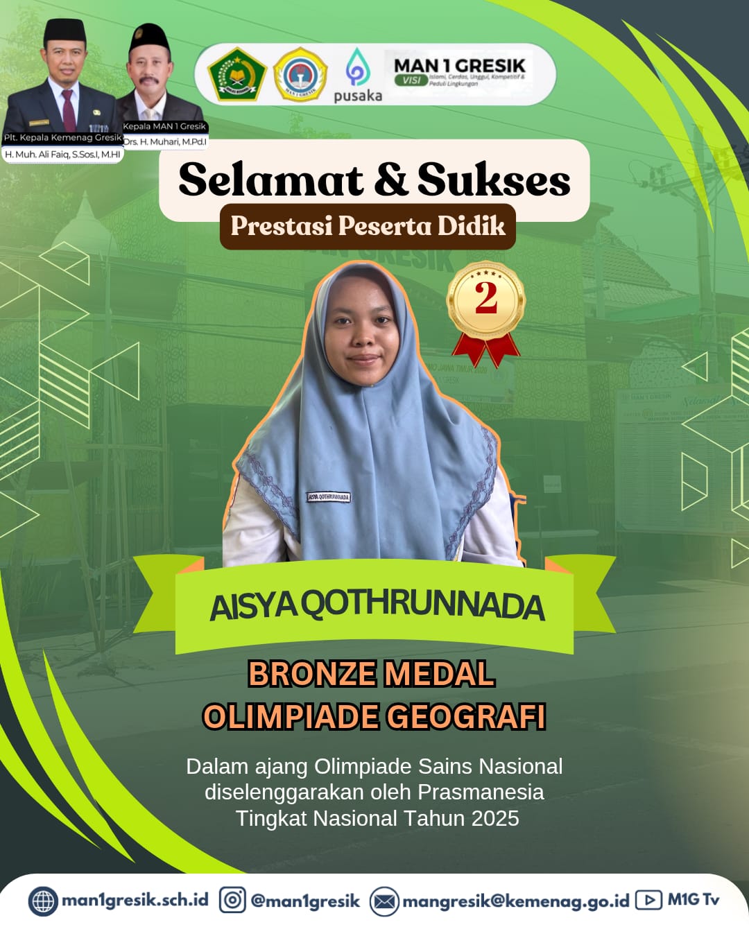 MAN 1 Gresik kembali menorehkan prestasi gemilang di tingkat nasional. Kali ini, Aisya Qothrunnada, siswi kelas XI-1, berhasil meraih Bronze Medal dalam Olimpiade Geografi yang diselenggarakan oleh Prasmanesia pada tahun 2025. Keberhasilan ini menjadi bukti nyata dedikasi, ketekunan, dan semangat belajar Aisya dalam mendalami ilmu geografi. Prestasi tersebut tidak hanya membawa kebanggaan bagi dirinya sendiri,…
