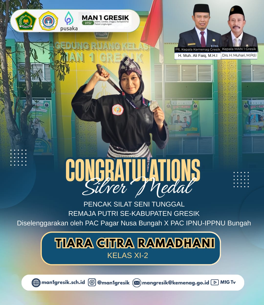Kabar membanggakan kembali ditorehkan oleh siswa MAN 1 Gresik. Tiara Citra Ramadhani, siswi kelas XI-2, berhasil meraih Medali Perak (Silver Medal) pada cabang Pencak Silat Seni Tunggal Remaja Putri tingkat Kabupaten Gresik. Ajang bergengsi ini diselenggarakan oleh PAC Pagar Nusa Bungah bekerja sama dengan PAC IPNU–IPPNU Bungah, dan diikuti oleh peserta terbaik dari berbagai sekolah…