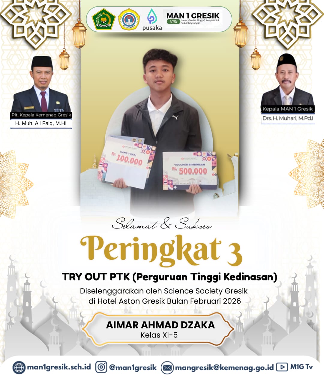 Kabar membanggakan kembali datang dari MAN 1 Gresik. Salah satu siswa terbaiknya, Aimar Ahmad Dzaka (kelas XI-5), berhasil meraih Peringkat 3 dalam ajang Try Out PTK (Perguruan Tinggi Kedinasan) yang diselenggarakan oleh Science Society Gresik. Kegiatan bergengsi ini berlangsung di Hotel Aston Gresik pada Februari 2026 dan diikuti oleh peserta dari berbagai sekolah yang memiliki…