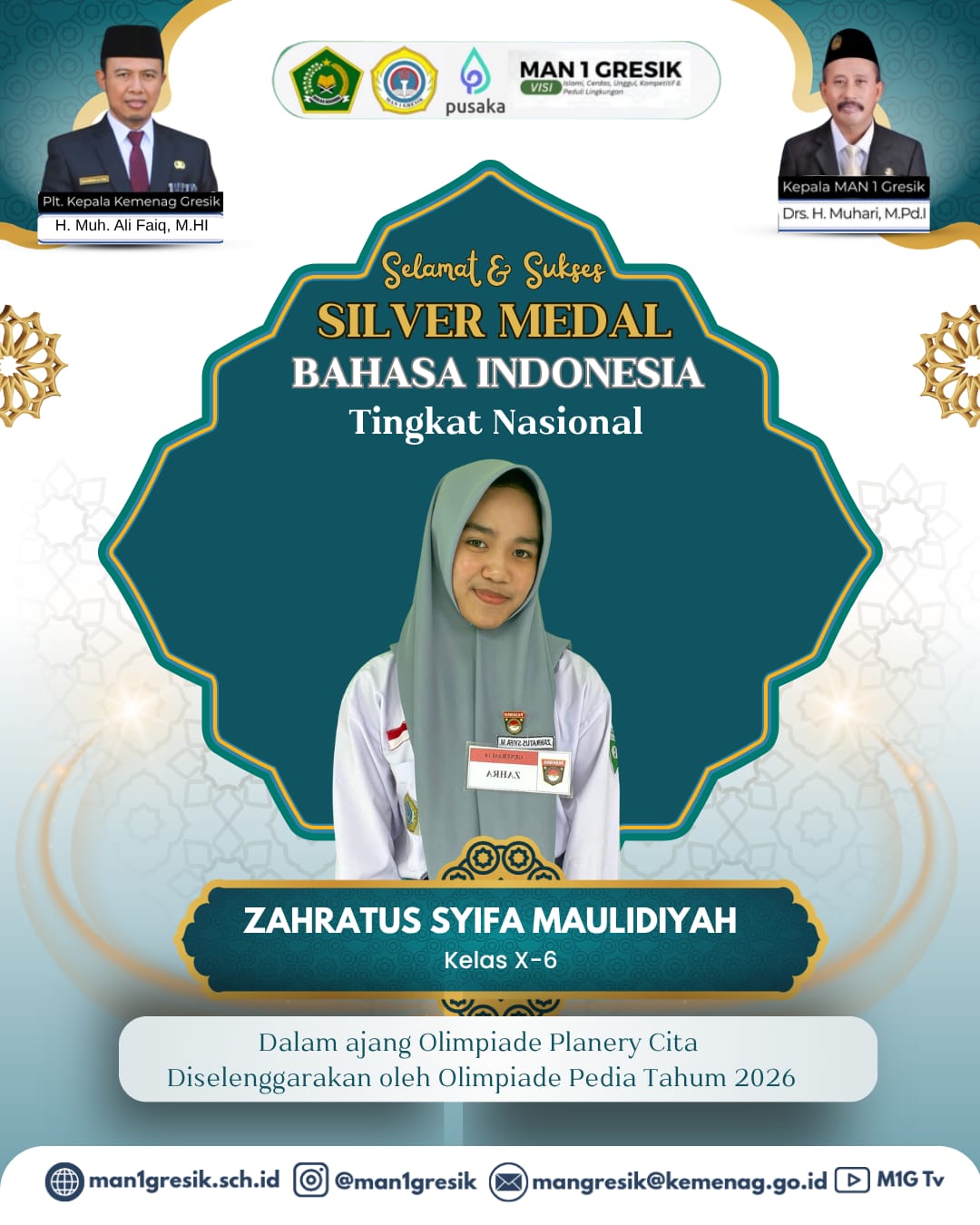 Read MoreGRESIK – Prestasi membanggakan kembali ditorehkan oleh siswa MAN 1 Gresik di kancah nasional. Kali ini, ananda Zahratus Syifa Maulidiyah, siswi kelas X-6, berhasil menyumbangkan medali perak (Silver Medal) dalam bidang studi Bahasa Indonesia. Prestasi gemilang ini diraih dalam ajang Olimpiade Planery Cita yang diselenggarakan oleh Olimpiade Pedia Tahun 2026. Kompetisi ini diikuti oleh berbagai…