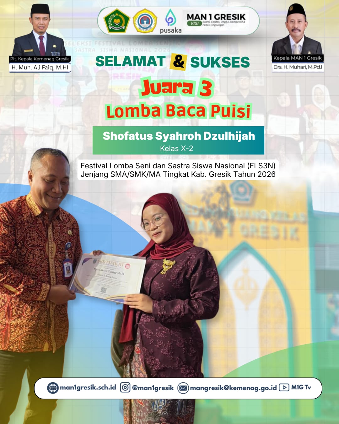Alhamdulillah. Luar biasa!Prestasi membanggakan kembali diraih oleh siswa MAN 1 Gresik. Salah satu siswi terbaiknya, Shofatus Syahroh Dzulhijjah dari kelas X-2, berhasil meraih Juara 3 Lomba Baca Puisi pada ajang Festival Lomba Seni dan Sastra Siswa Nasional (FLS3N) tingkat SMA/SMK/MA se-Kabupaten Gresik Tahun 2026. Prestasi ini menjadi bukti bahwa siswa MAN 1 Gresik tidak hanya…