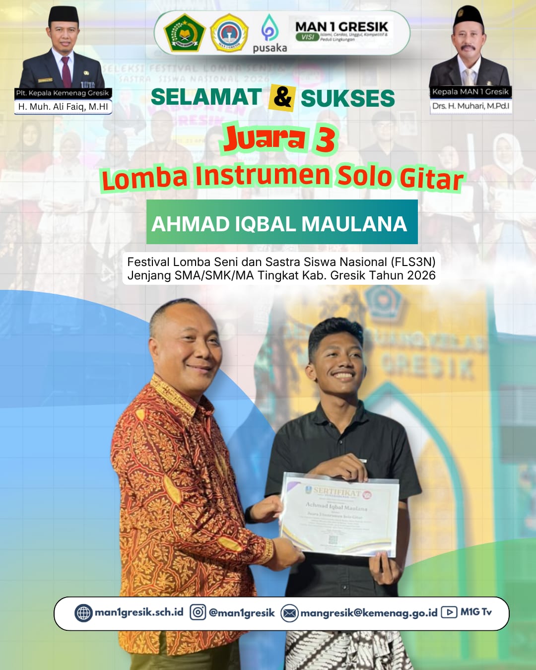 Read MoreKabar membanggakan kembali datang dari keluarga besar MAN 1 Gresik. Salah satu peserta didik terbaiknya berhasil menorehkan prestasi di tingkat nasional dalam ajang lomba poster digital. Nadya Triana Regnawati, siswi kelas XII-4, berhasil meraih Juara 2 Lomba Poster Digital tingkat nasional yang diselenggarakan oleh Fun Children pada tahun 2026. Prestasi ini menjadi bukti nyata kreativitas,…